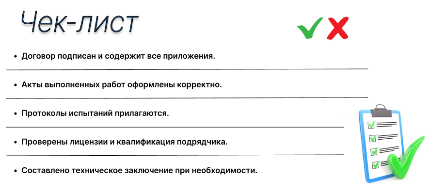 • Проверка лицензий и допусков подрядчика через официальные реестры.