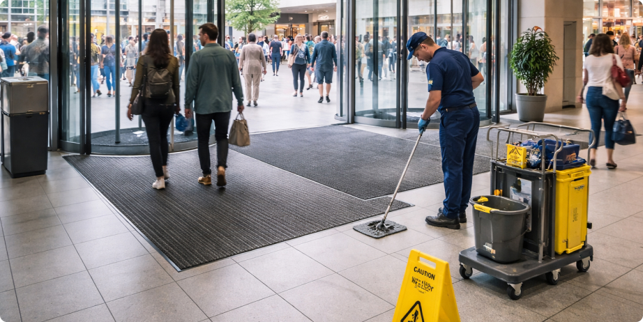 Межсезонье резко увеличивает абразив и воду. Если вход “держит” абразив, нагрузка на галереи падает. Поэтому регламент на вход обычно выделяют отдельно: ковровые решения, частая механика, контроль луж, доводка первых метров. Это продлевает ресурс плитки, керамогранита и полимеров и снижает “серость” покрытия.