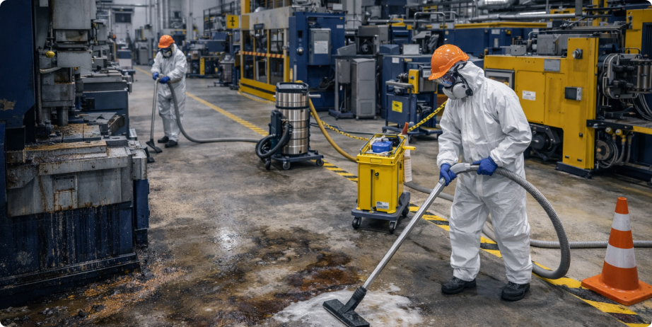 Удаление масла с пола часто идёт в зонах движения техники. Поэтому заранее согласуют ограждение участка, обходные маршруты, окна работ, порядок обозначения мокрых зон, требования к СИЗ. При проливах удобны сорбенты и локальные наборы реагирования: они ускоряют первичный сбор и снижают риск падений, после чего идёт полноценная очистка по технологии.