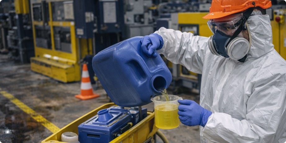 Перед обезжириванием производственных полов удобна простая классификация: свежий пролив, застарелое пятно, следы шин с масляной фракцией, эмульсия/СОЖ, локальные капли у оборудования, загрязнение в швах и пористых основаниях. Для каждого типа определяют метод: механика, локальная химия, сорбенты, многопроходная схема, промывка и сбор. Такая классификация сокращает споры и помогает оценить трудоёмкость честно.