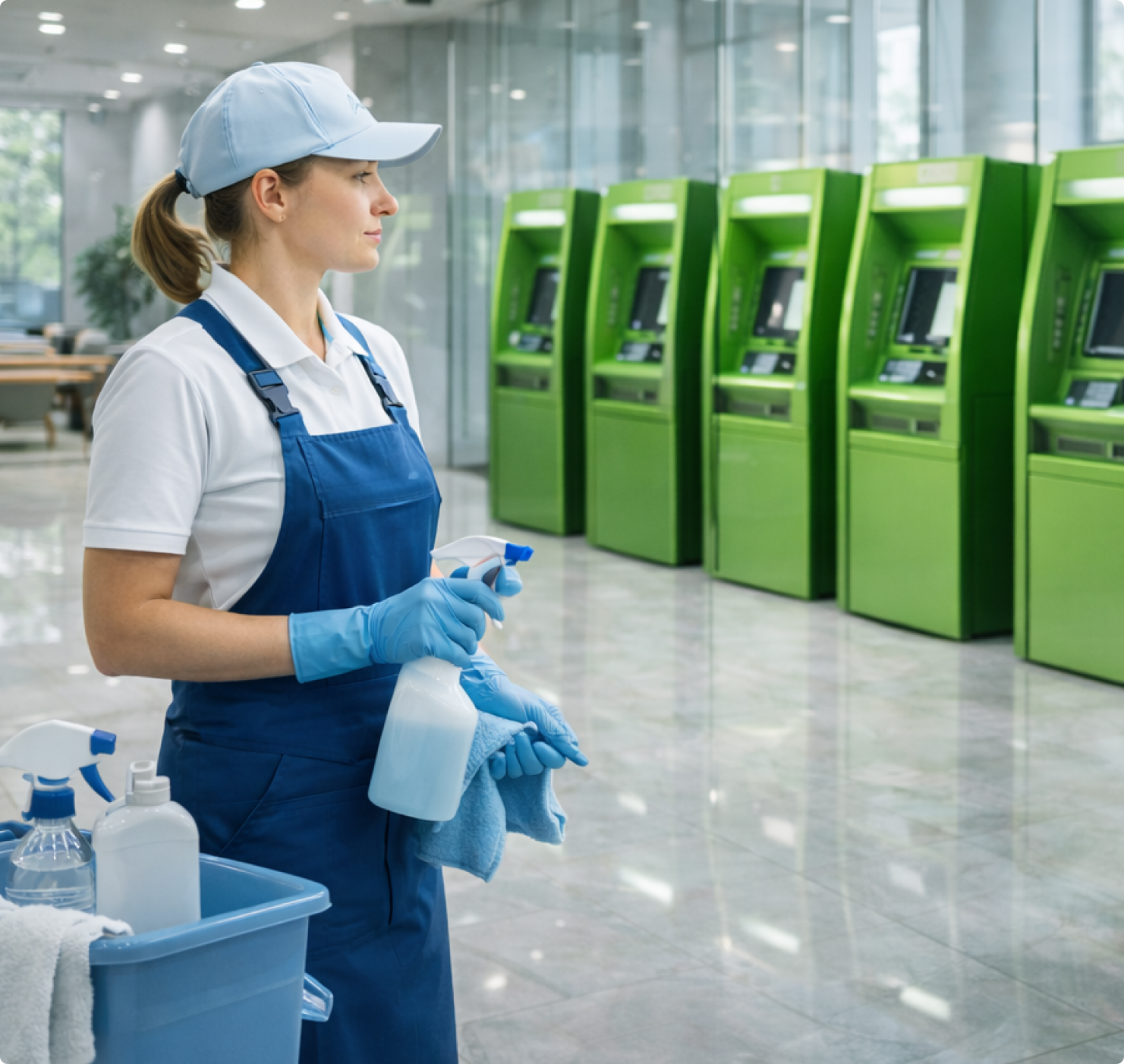 Ежедневная уборка включает: влажную уборку полов с применением профессиональной поломоечной техники, обеспыливание горизонтальных поверхностей, мебели и оргтехники, дезинфекцию контактных поверхностей — ручек дверей, кнопок терминалов, стоек и поручней, уборку и дезинфекцию санузлов с пополнением расходников, вынос мусора с заменой пакетов, уборку входной группы. Зоны банкоматов, которые расположены в вестибюле или на улице, обслуживают по отдельному протоколу с повышенной кратностью из-за высокой проходимости: кнопки, экран и корпус банкомата входят в перечень контактных поверхностей, подлежащих дезинфекции при каждом обходе.