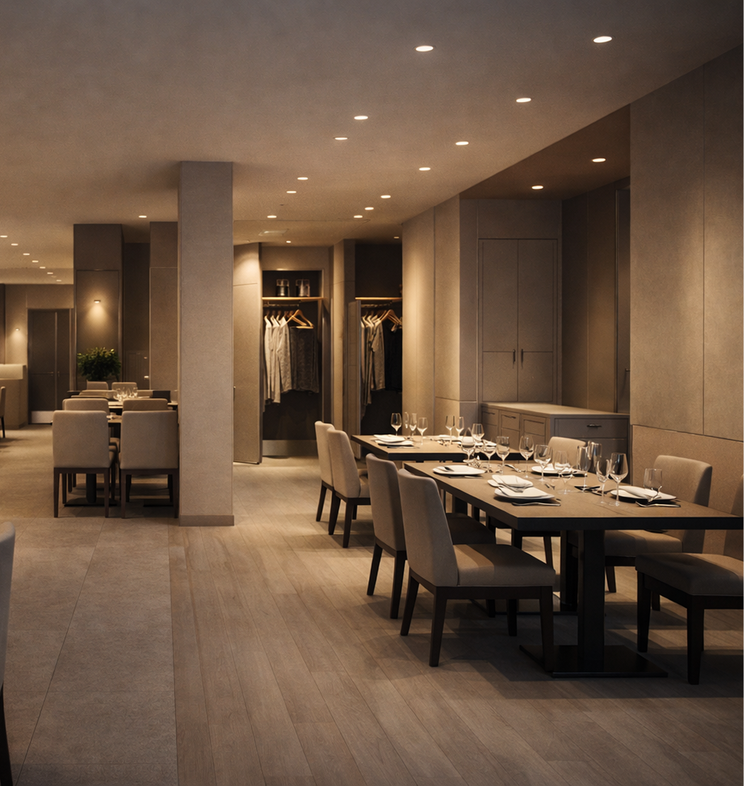 Нужно было обновить ресторан так, чтобы соседняя зона продолжала работать. Работы разделили по участкам, закрыли защитой то, что нельзя трогать. Всё прошло спокойно, без лишней грязи и повреждений. По срокам уложились, перед открытием успели всё подготовить.