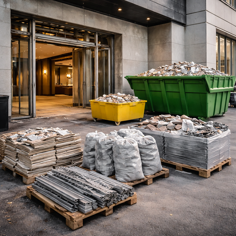 Работы начинаются с оценки объёмов и состава мусора: мешки со штукатуркой и плиткой, демонтированные конструкции, металл, стекло, упаковка материалов. От объёма зависит формат логистики: контейнер на улице, частые рейсы на вывоз или комбинированная схема. Для БЦ и ТРЦ отдельно учитываются правила УК: где допускается складирование, какие лифты разрешены, в какие часы разрешён вынос.